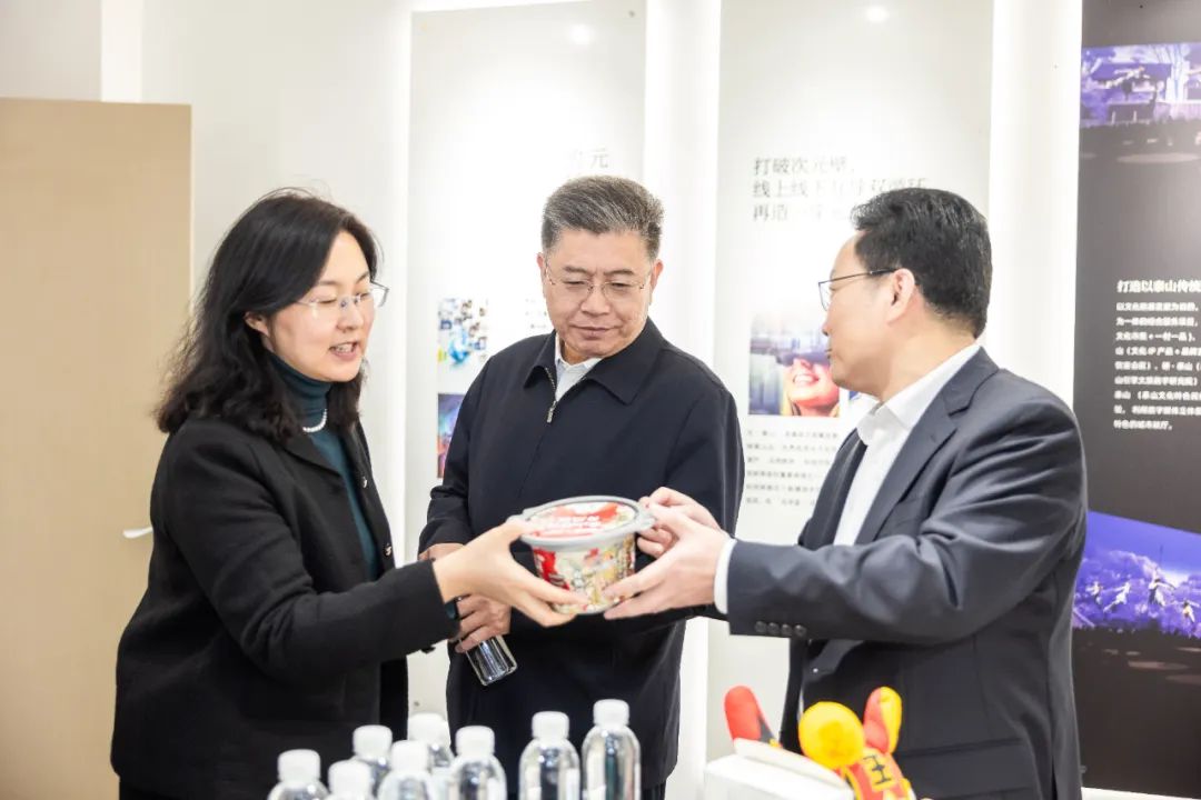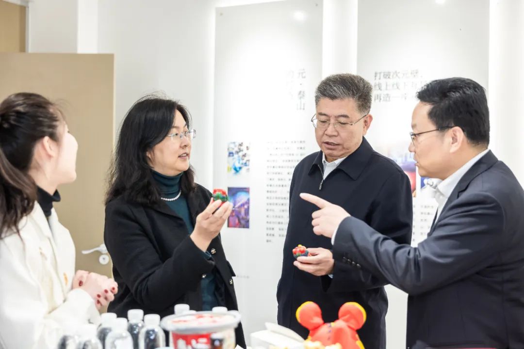 郭德文一行對(duì)智慧文旅基地、電商直播間、文創(chuàng)研發(fā)中心等區(qū)域進(jìn)行了實(shí)地參觀(guān)。并現(xiàn)場(chǎng)聽(tīng)取工作人員對(duì)以泰山IP為核心的“泰山出品文創(chuàng)系列”、“元泰山數(shù)字科技”、“朝山歸文旅品牌”以及“泰山產(chǎn)品供應(yīng)鏈”等業(yè)務(wù)的詳細(xì)介紹。